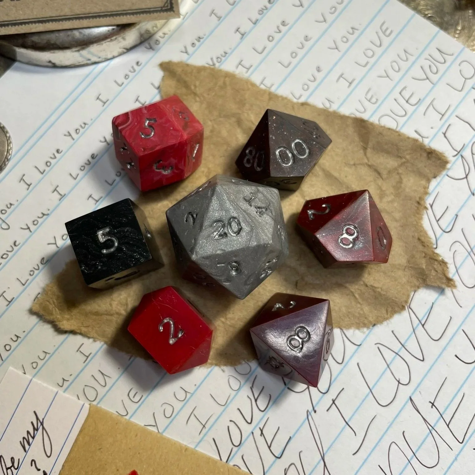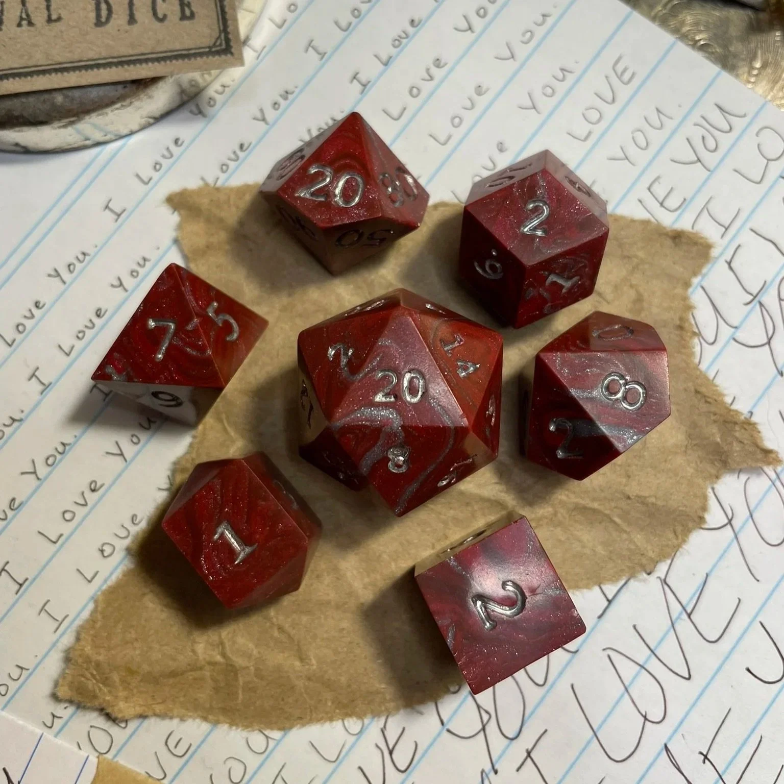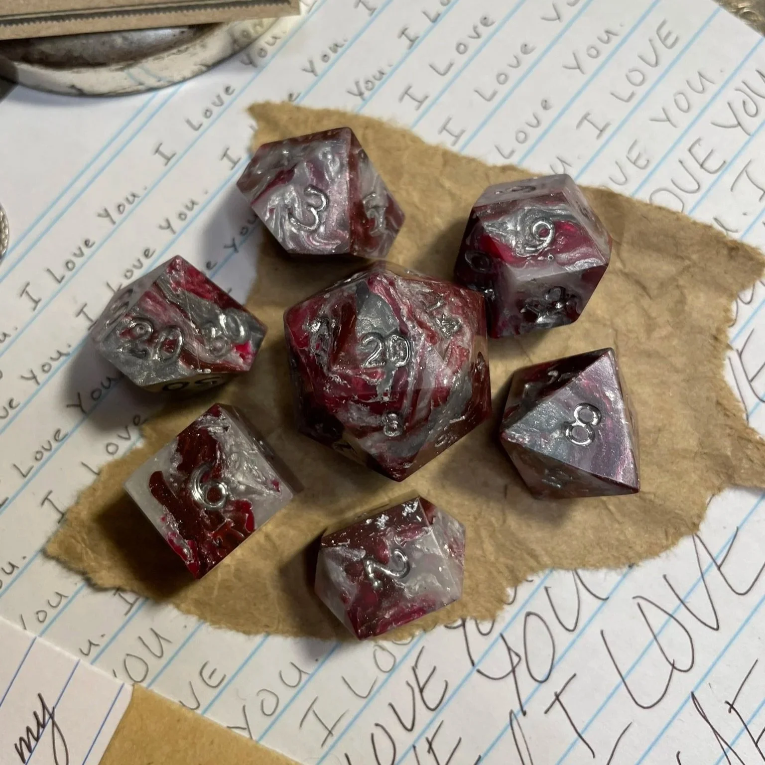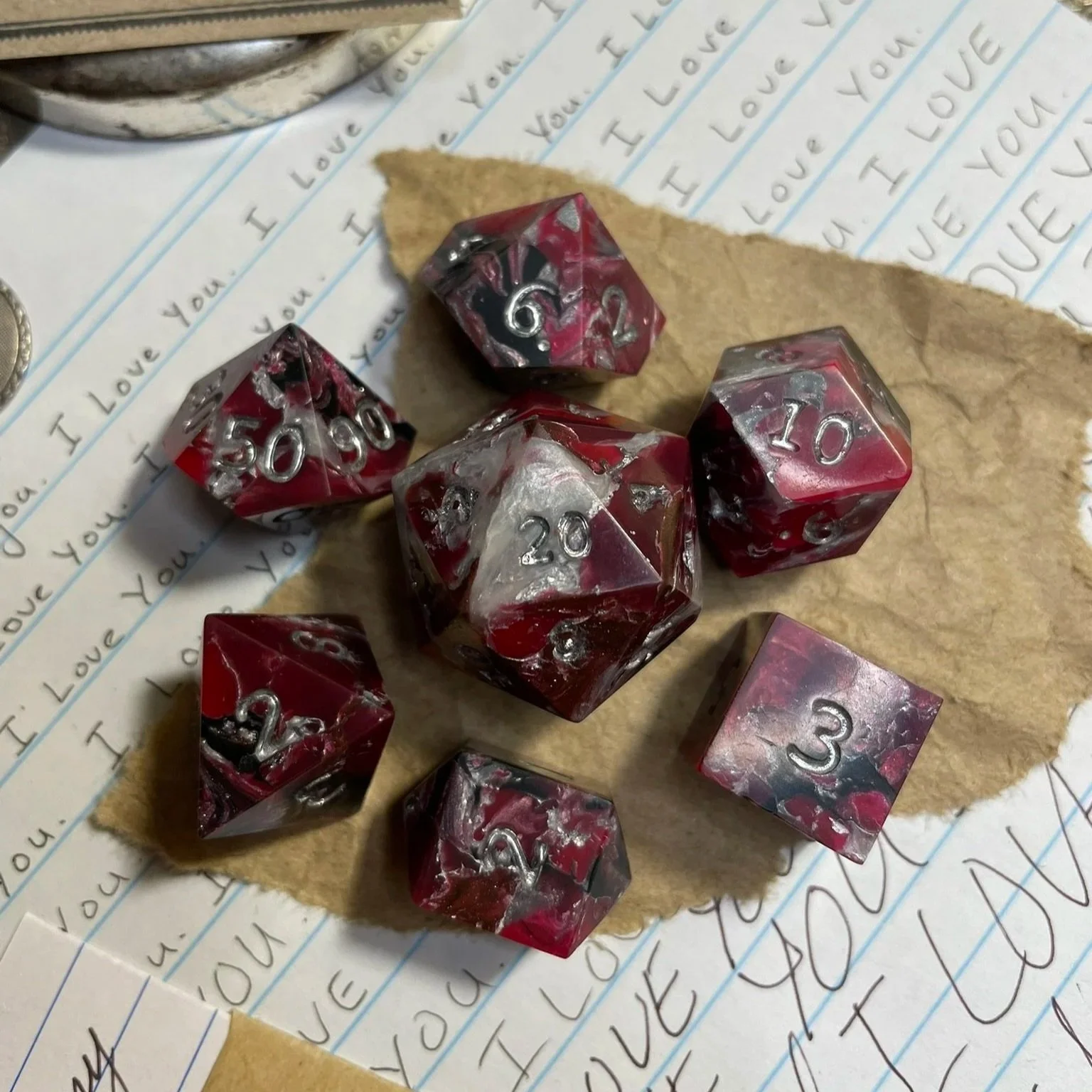 A handmade silver and red marbled polymer clay with silver leaf sharp-edged polyhedral seven-piece dice set with chrome numbering.
