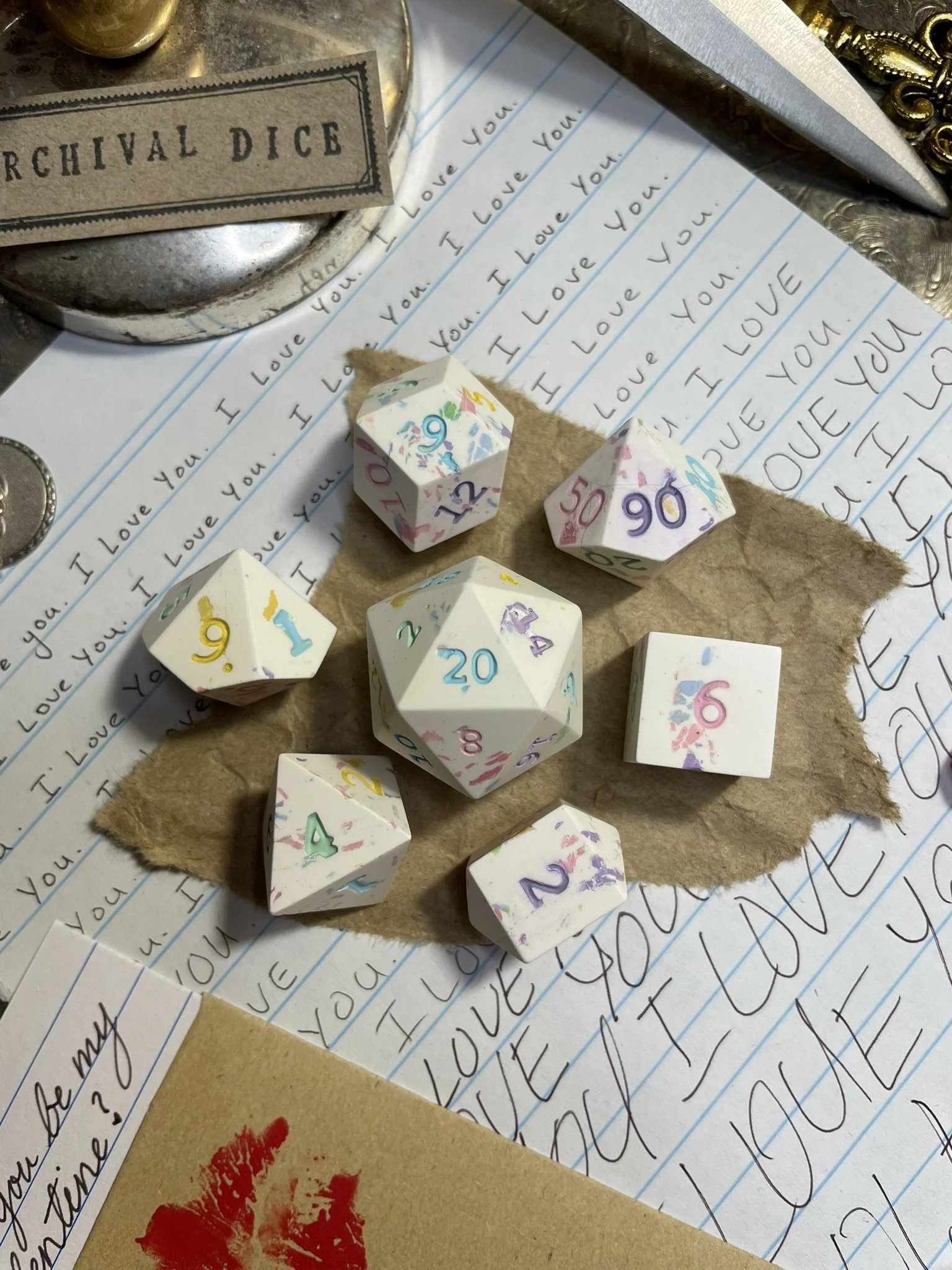 A handmade white and rainbow pastel terrazzo marbled polymer clay sharp-edge polyhedral seven-piece dice set. With alternating pastel rainbow numbering.
