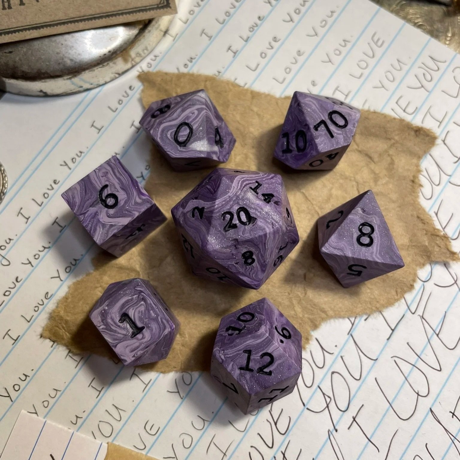 A handmade finely marbled glittery purple polymer clay sharp-edge polyhedral seven-piece dice set. With deep purple numbering.