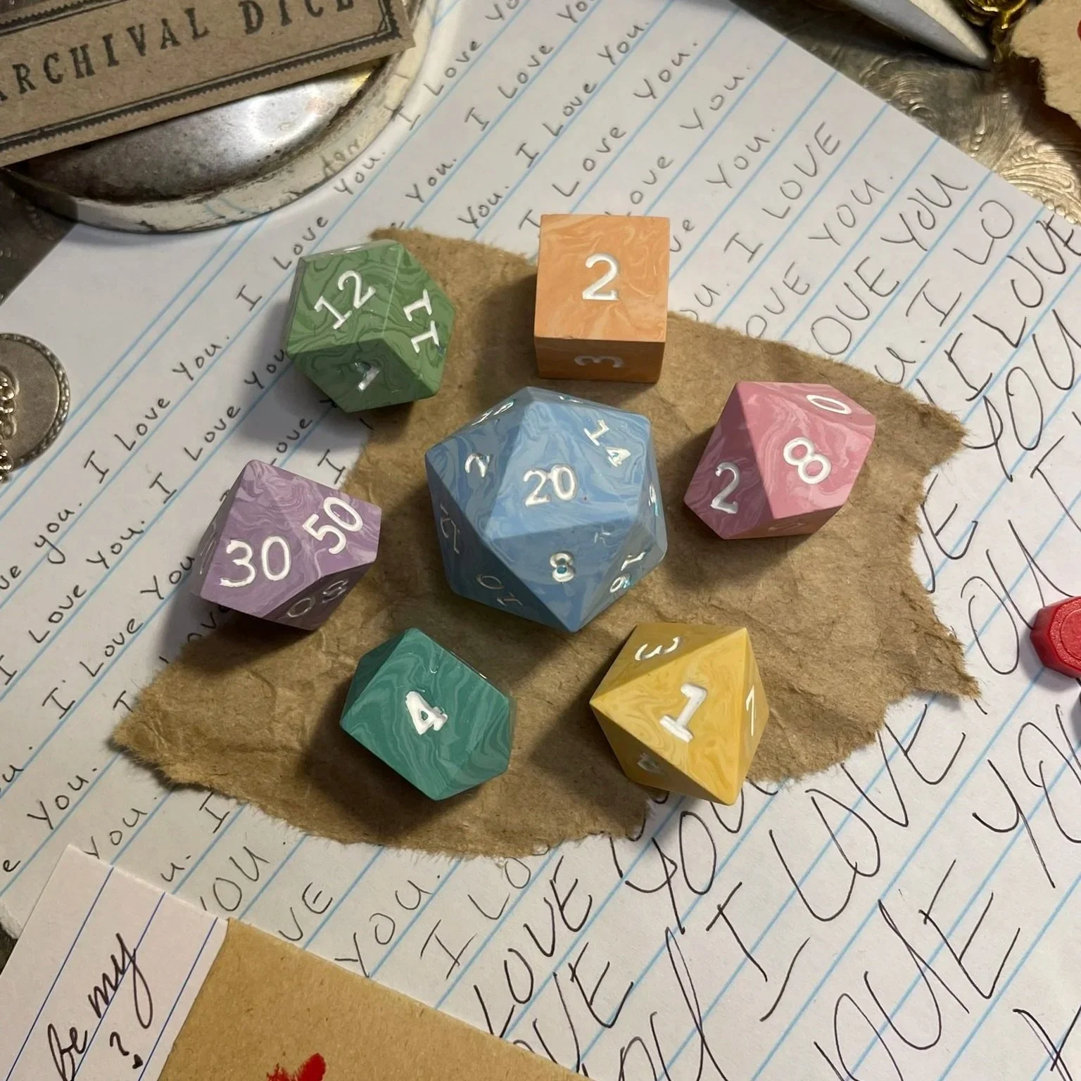 A handmade mixed pastel rainbow marbled polymer clay sharp-edge polyhedral seven-piece dice set. With bright white numbering.