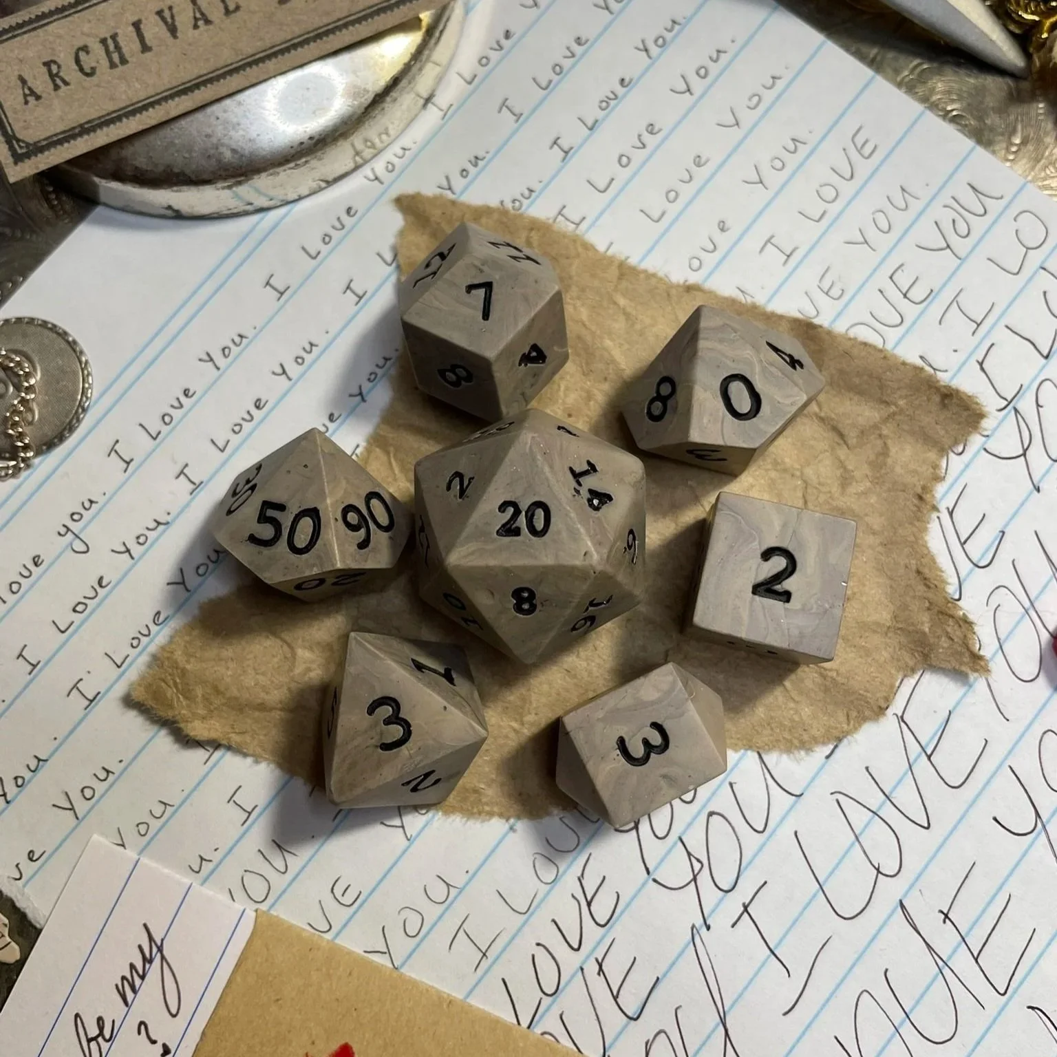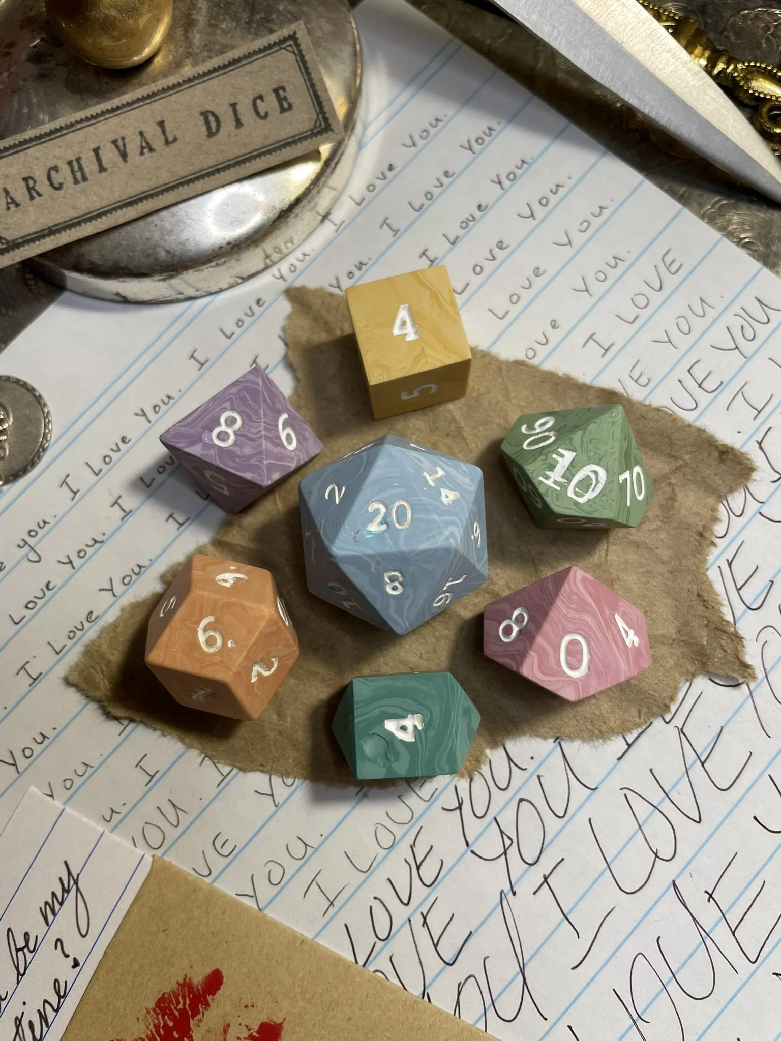 A handmade parchment and translucent beige marbled polymer clay sharp-edged polyhedral seven-piece dice set with matte black numbering.