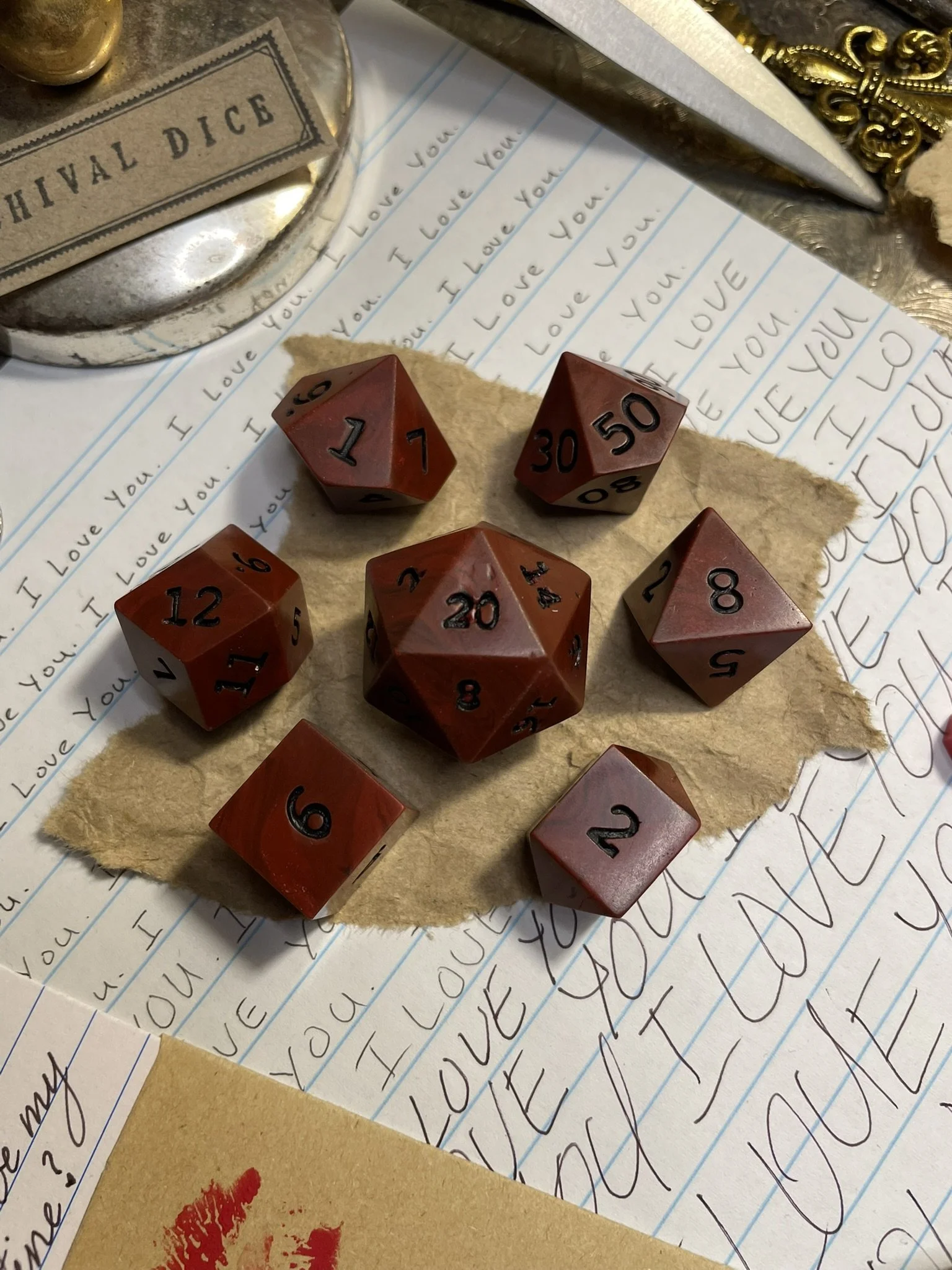 A handmade deep red finely marbled polymer clay sharp-edged polyhedral seven-piece dice set with matte black numbering.